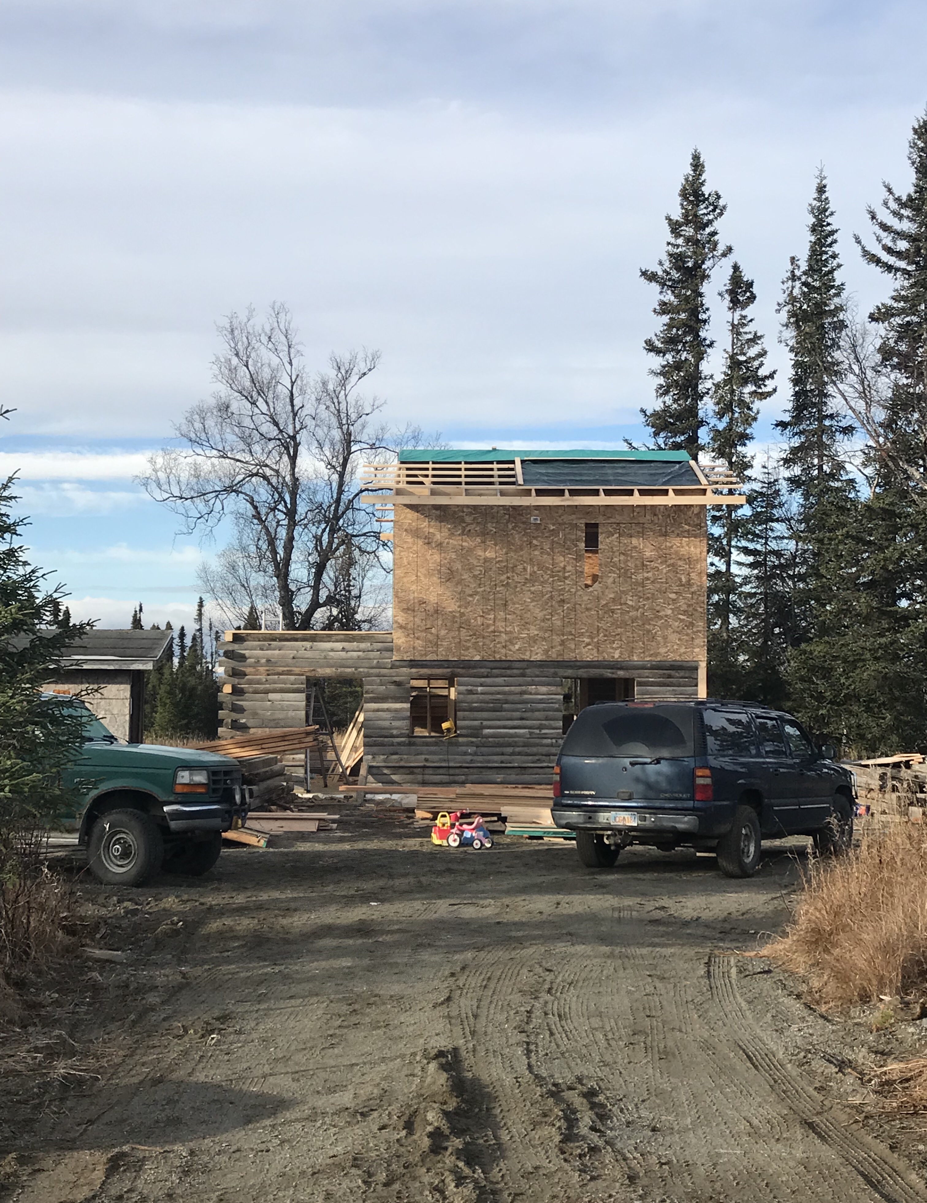 Looking back at pictures from a year ago disproves our feelings of inadequate progress thankfully. Last year at this time we were residing in a 240 sq ft auto shelter with only a propane buddy heater for warmth. We lived lived in that space for nearly 4 months, throughout the coldest part of an Alaskan winter. Luis roofed it with tin and lined the inside of the walls and ceiling with foam board insulation but it still got cold enough that in the evenings and mornings we could see our breath in the air. Lots of blankets on our beds ensured that we stayed warm at night and during the day we wore layers of clothing(tho I never was very successful at keeping socks on the children). Our toilet was a 5 gallon bucket with a special lid/seat and it was situated in an unheated shed on the other side of the driveway. There were no windows so all our lighting came from two floor lamps or from battery powered LED lights, which we utilized when the generator was turned off. Of course there was no running water either and no sink or countertops so all dish washing was done by heating water on the stovetop and then using dishpans on the table. We learned many things throughout that time though and I’m grateful for all those lessons. Things like: how many luxuries we take for granted(even those of us raised in ‘plain’ homes), how resilient children are and how easily contented they are if we just stop handing everything to them on a silver platter, how small a home can be and still be quite sufficient, etc. God also taught me some lessons on contentment and patience as the cabin project strung on longer than anticipated (doesn’t that always happen with building projects?).